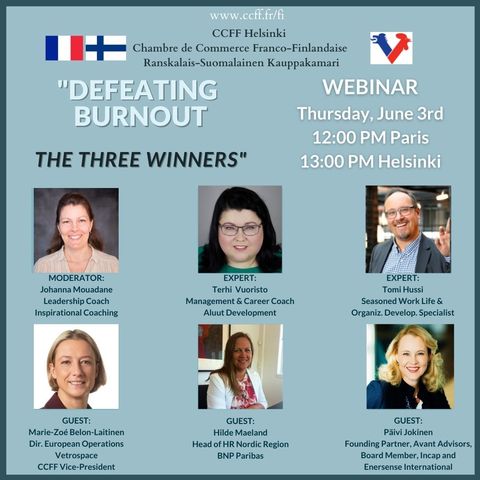 Three wonderful coaches gave us some insights on how to spot burnout and how to avoid it: Terhi Vuoristo, Tomi Hussi and the moderator Johanna Mouadane. All three are Finns - however, Johanna has been living in Paris for more than 20 years and Terhi and Tomi have worked in international environments.