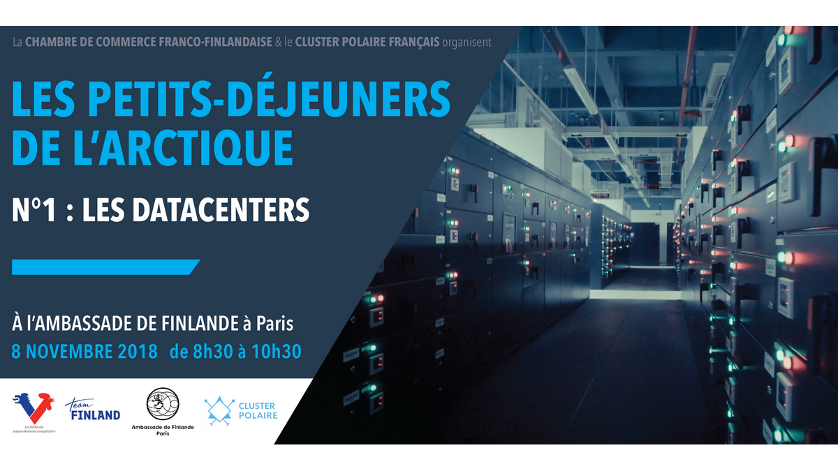 Le premier petit-déjeuner thématique de notre série de petits-déjeuners de l'Arctique aura lieu le jeudi 8 novembre de 8h30 à 10h30 à l'Ambassade de Finlande à Paris ( 1 place de Finlande, 75007 Paris ). Le thème de ce premier petit-déjeuner est les Datacenters.