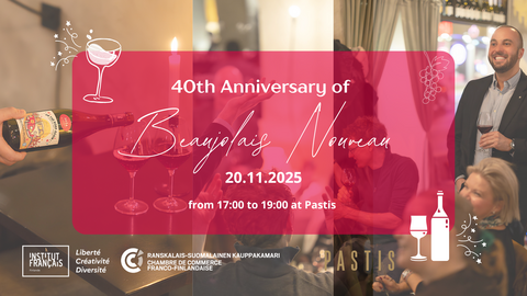 The French-Finnish Chamber of Commerce, in collaboration with the Institut Français, invites you to join us for an evening of French wine, good company, and convivial spirit on Thursday, November 20th, 2025, from 17:00 to 19:00 at Pastis (Pieni Roobertinkatu 2, Helsinki).